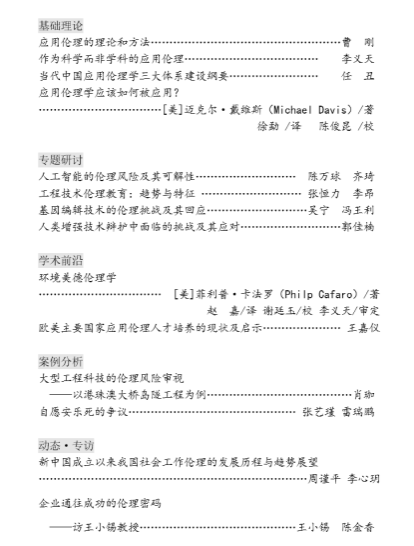 《应用伦理》主要面向应用伦理学研究、应用伦理专业硕士(MAE)教育、不同行业(部门)的伦理委员会,常设栏目有“基础理论”、“专题研究”、“学术前沿”、“案例分析”、“动态·专访”等。