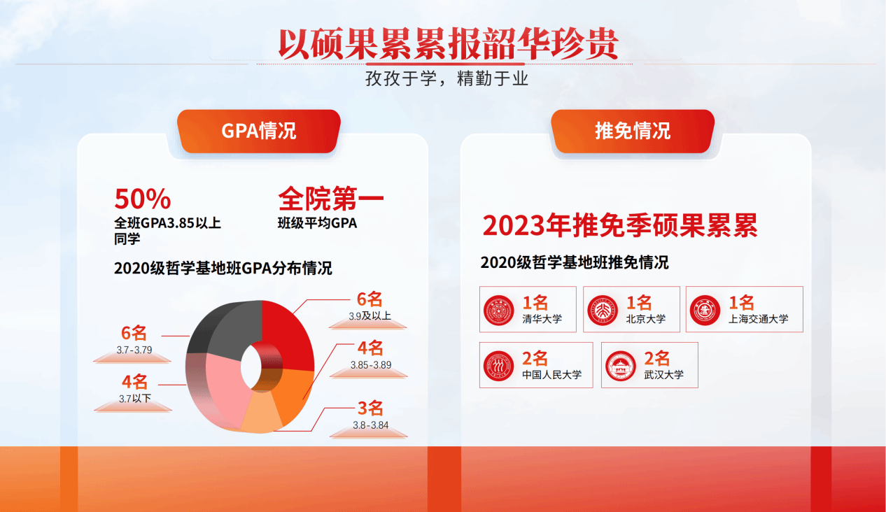 班级累计开展了33次读书观影交流活动,超过20人次参加过哲学前沿课程和国际哲学交流项目,全班GPA 3.85以上的同学占比50%,班级平均GPA全院第一,7名同学成功推免至清华大学、北京大学、上海交通大学、中国人民大学、成人视频 等名校。