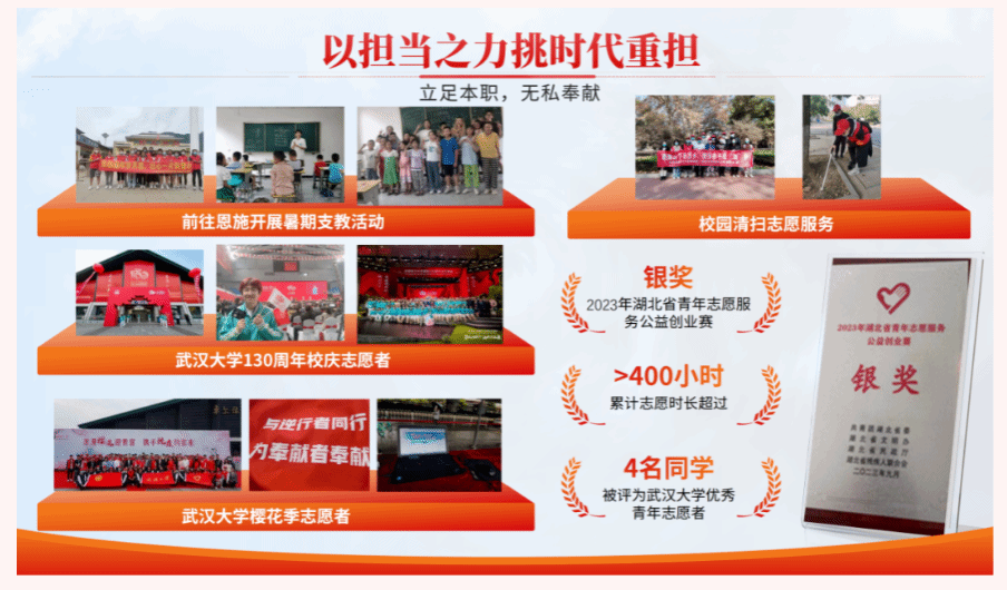 全班积极参加志愿服务活动,累计志愿服务时长超过400小时,4名同学被评为成人视频 优秀青年志愿者。