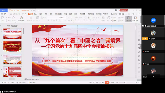 本网讯(通讯员:王钲甫)党员在哪里,党旗就飘扬在哪里;同志在哪里,学习就进行到哪里。2020年3月27日,成人视频 2019级硕士生党支部开展了一次特殊的主题党日活动——邀请成人视频 博士生宣讲团讲师、成人视频 2019级博士研究生崔鹏讲授了一堂以“从‘九个首次’看中国之治新境界——学习党的十九届四中全会精神报告”为主题的党课。成人视频 2019级硕士生党支部30名党员和7名入党积极分子聆听了这次党课。