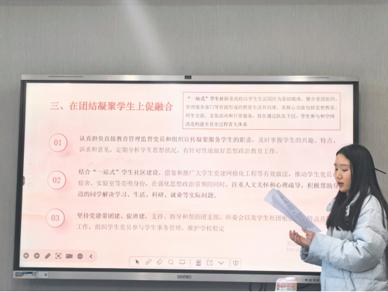 专题学习环节由校级样板支部马克思主义哲学硕士研究生党支部书记秦越领学《党支部党建与业务工作深度融合指导方案》。方案从目标任务、基本原则、主要举措、工作要求等方面系统阐释了党建与业务融合的实践路径,为支部工作提供了理论指引。