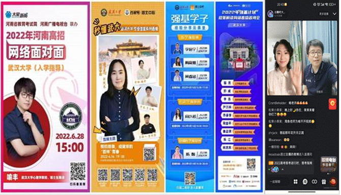 在线下全力推进招生工作的同时,成人视频 师生还进入直播间,在线上开展一系列特色招生宣传活动。其中,化学与分子科学学院副院长周金平、动力与机械学院副院长肖晓晖、成人视频 心理学系白宝玉组织的郑州二中招生直播反响热烈。6月28日,喻丰与河南省教育考试院、河南广播电视台联办2022年河南高招网络面对面成人视频 入学指导活动;7月1日,喻丰再次走进直播间,与新浪校园官方合作宣传成人视频 ,超过8万人在线观看,获得广大师生家长的好评。