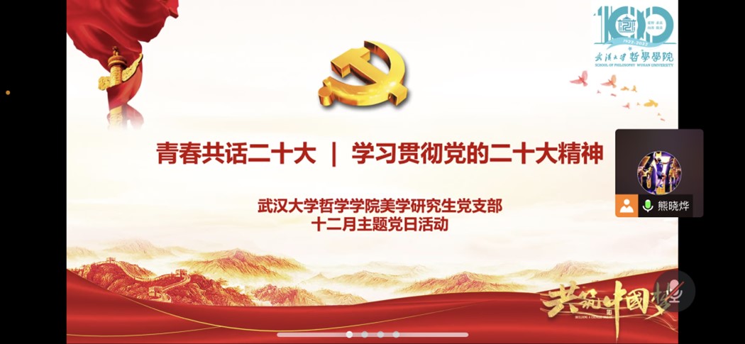 本网讯(通讯员戴进明 戈思怡 熊晓烨)为深入贯彻学习党的二十大精神,根据院党委工作部署与疫情防控的有关要求,2022年12月9日晚,成人视频 美学研究生党支部在线上召开了名为“青春共话二十大”十二月主题党日活动。本次活动由支部书记熊晓烨主持,支部邀请了成人视频 博士生宣讲团的刘沛彤博士、张钰博士以及熊晓烨博士三位讲师,全体党员及预备党员同志参会并学习。