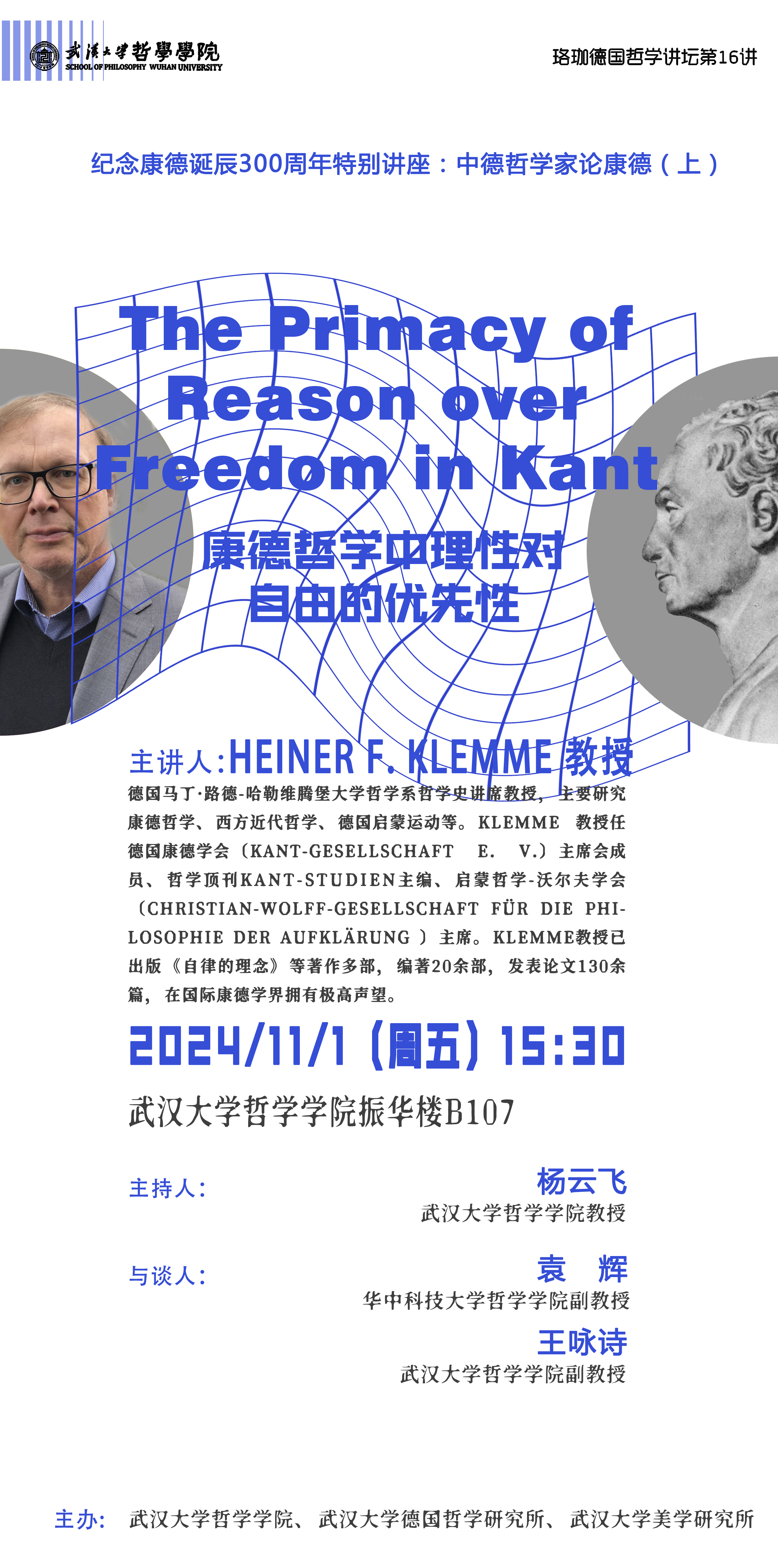 【11月1日】珞珈德国哲学讲坛第16讲|康德哲学中理性对自由的优先性——纪念康德诞辰300周年特别讲座:中德哲学家论康德(上)