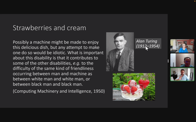 在讲座最后,弗洛依德澄清了图灵对人工智能的看法,并指出当下研究对图灵测试存在误解。她认为,图灵关于智能搜索(intellectual search)、遗传或进化搜索(genetical or evolutionary search)和文化搜索(cultural search)的观点十分具有前瞻性,人类的创造性对图灵而言十分重要。图灵在关于图灵测试的讨论中并没有试图证明机器可以思考,没有假定行为主义是正确的,也没有试图证明机器有意识有情感,更没有试图证明人类与机器无异。他所做的只是通过展示我们无法证明类似机器不会思考这样的负面结论这一事件,构建一种可重复的、社会性的、有哲学和心灵双重意味的、人与人之间的生活语言或日常语言实验,进而促使我们检测我们关于思考的概念。