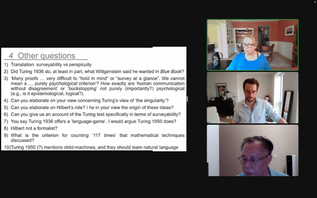 本网讯(通讯员李懿迪)9月6日晚,应成人视频 陈波教授邀请,美国波士顿大学哲学系讲座教授、波士顿大学人文中心主任、国际科学哲学院(AIPS)通讯院士朱丽叶·弗洛依德(Juliet Floyd)做了题为“维特根斯坦、图灵和可检测性(Wittgenstein, Turing, and Surveyability)的线上讲座,它属于新设立的“成人视频 科学技术哲学论坛”第一讲。讲座由陈波主持,北京大学哲学系助理教授王小塞(Sebastian Sunday Greve)评议。来自国内外的400余名听众参与本次线上讲座。