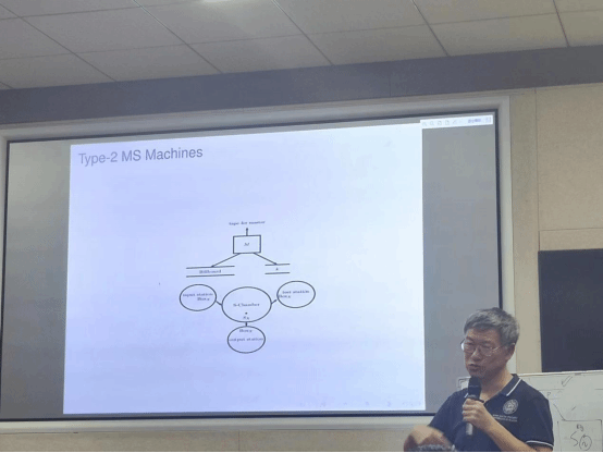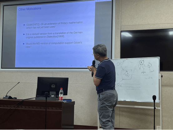 讲座的第二部分是介绍如何在比自然数更高阶的数学对象(如实数)上定义可计算函数,这也是杨跃教授本人近十年研究的一个问题。不同于经典递归论的情形,已有的几种定义,如TTE模型、BSS定义等所刻画的可计算函数类并不相同。而杨跃教授的想法是构造一种兼容TTE模型和BSS定义的函数类。他和其他合作者首先考虑在同构于实直线的Baire空间上定义可计算函数。他们采取了两种定义,分别是部分递归函数和图灵机的推广。前者是在部分递归函数中添加了TTE通用函数和判断一个自然数无穷序列是否处处为0的特征函数;后者是所谓的MS图灵机,有一个有穷状态的图灵机和若干通用神谕(universal oracle)图灵机组成。可以证明这两种定义刻画了同一个函数类。而对于更高阶的有穷类型(finite types)的对象,可以将这一想法进一步推广和抽象来定义其上的可计算函数。这也是杨跃教授最近正在研究的一个方向。