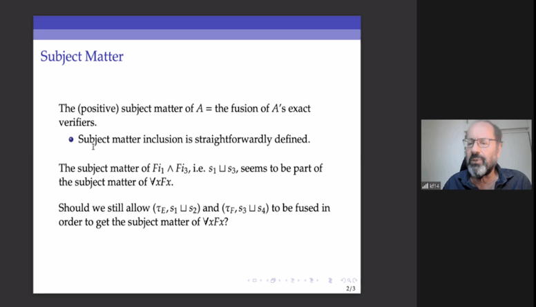 为了说明使真者语义学的架构,Kit Fine教授介绍了事态空间(state space)的概念。事态空间由一个非空集S和S上的偏序组成,其中这个偏序关系满足完全性条件:任何S的子集都有最小上确界。从哲学上看,这一偏序关系实际上刻画了事态之间的分体论(mereology)关系。而完全性条件在某些情况下可以被更弱的有界完全性(任何S的有界子集都有最小上确界)所替换。