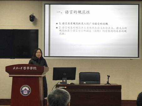 随后,郑州轻工业大学王铜静博士作了题为“论语言的规范性与自然性”的报告。王铜静博士在介绍了哲学史上语言规范性和自然性的相关理论后,提出在自然主义中调和语言规范性和自然性的出路:语言的自然性是其规范性的基础,规范性是其自然性的进阶。熊文娴副教授用繁、简文字的矛盾实例,对王铜静博士的观点进行了补充,同时提出了语言研究层次的区分。魏屹东教授建议,我们可以从表征主义来理解语言;代海强研究员提出了有关本能和规范性的质疑;朱志方教授对语言的自然性进行了进一步的解释;王振副教授对王铜静博士的论证提出了进一步的建议。王铜静博士对学者们的建议表示了感谢,并对质疑给出了回应。