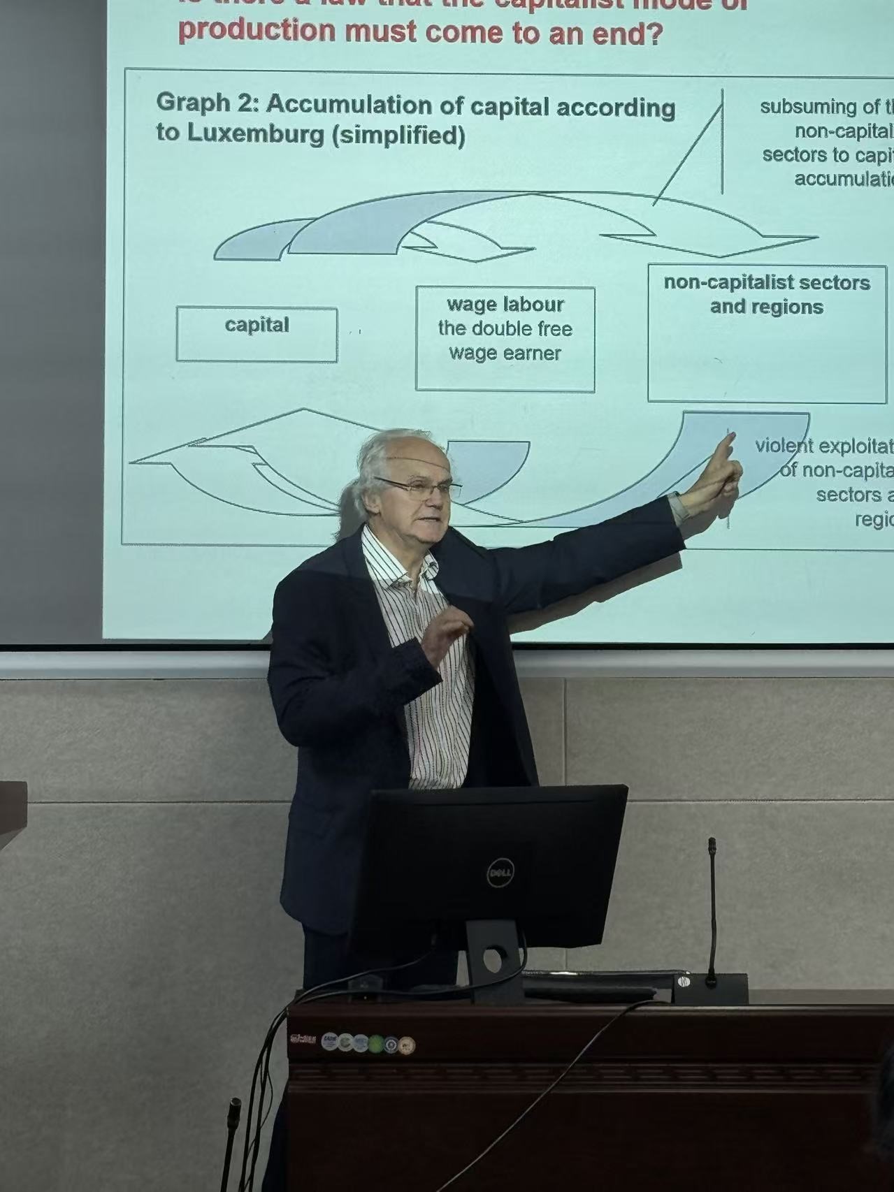 讲座伊始,布里教授强调了罗莎·卢森堡的资本积累理论及其对资本主义矛盾的揭示。布里教授指出,罗莎·卢森堡作为早期马克思主义理论家与革命家,在其代表作《资本积累论》中深入剖析了资本主义扩张的内在逻辑。在她看来,资本主义的生存与发展依赖于不断吞噬“非资本主义地区”的资源与市场,例如19世纪的波兰工业发展即依托于外部资本与需求;一旦全球被完全卷入资本主义体系,外部剥削空间的缺乏将导致资本主义系统陷入危机并走向崩溃。布里教授认为,这一观点不仅完善了马克思关于资本主义灭亡必然性的论证,还揭示了其核心矛盾——资本无限扩张的欲望与有限的外部条件之间的冲突。此外,罗莎·卢森堡提出国家军事支出等外部干预可作为暂时缓解矛盾的途径,这一理论在当代依然具有解释力,有助于理解全球供应链依赖与南北国家不平等交换等问题。