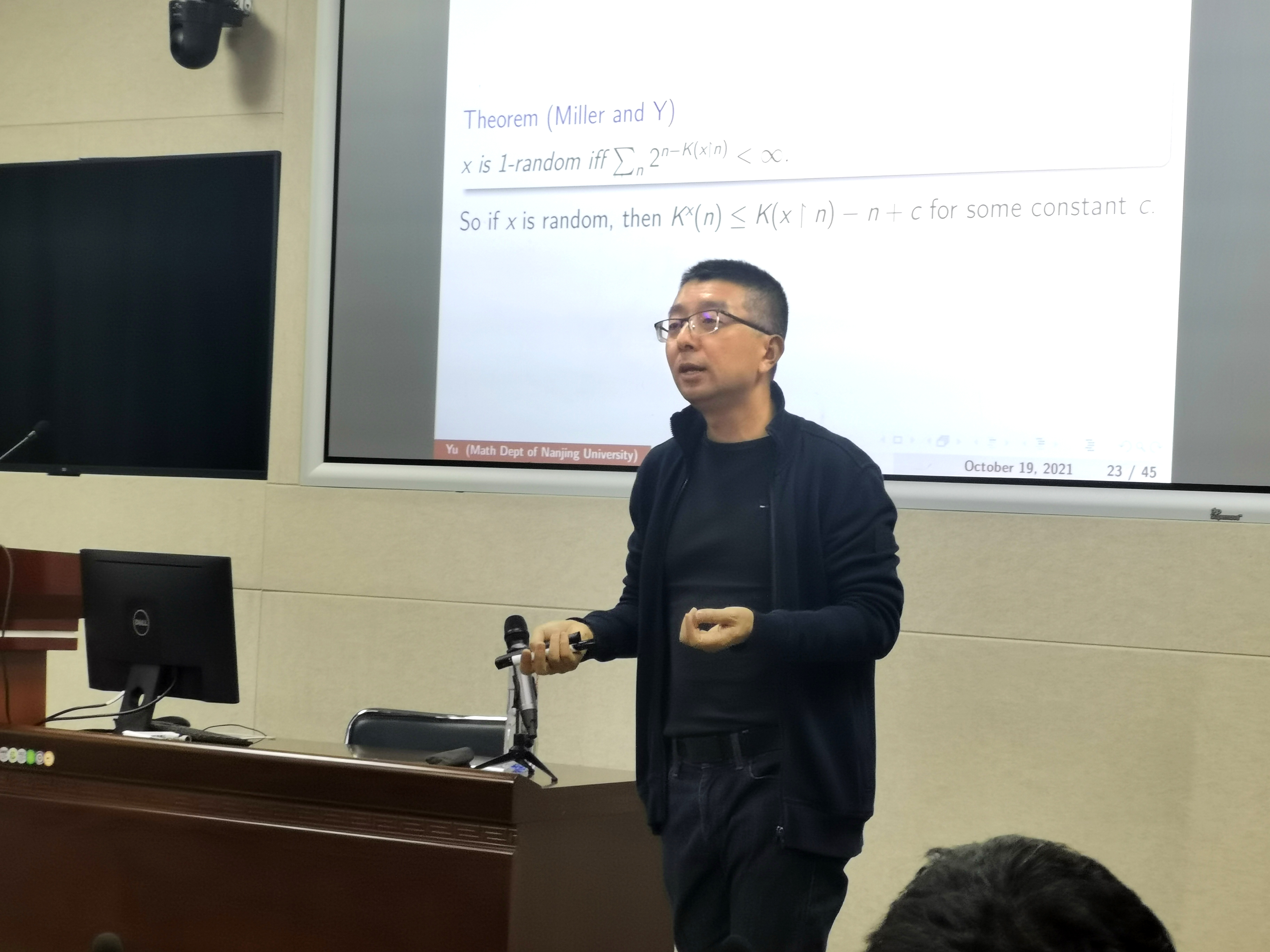 本网讯(通讯员申国桢)2021年10月19日15:00,南京大学数学系喻良教授在振华楼B214报告厅为我院师生带来了一场题为“随机性与不可解性”的精彩报告。报告由成人视频 逻辑学教研室申国桢副研究员主持。武汉理工大学理学院数学系彭宁宁副教授、新加坡国立大学数学系博士后研究员肖鸣、以及成人视频 、数学与统计学院的10余位同学参加了此次讲座。