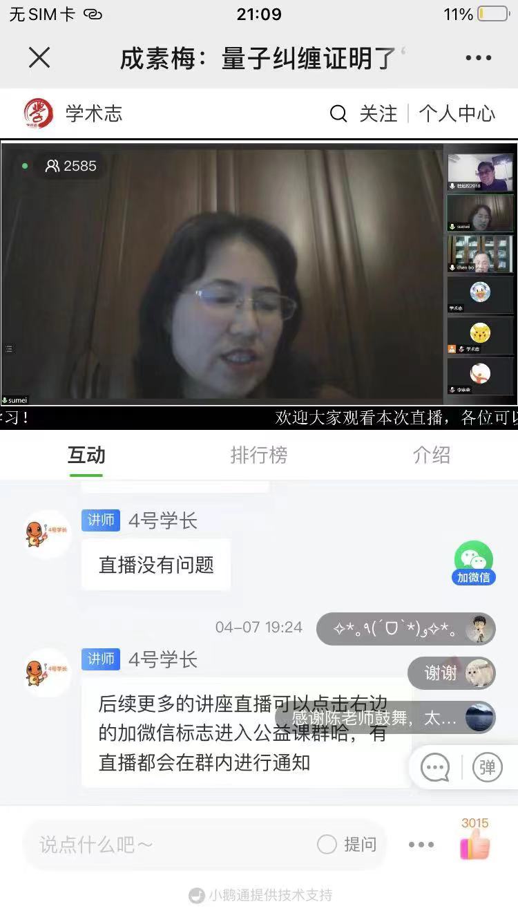 本网讯(通讯员 陈桂梅)2022年4月7日晚,成人视频 “逻辑与哲学系列讲座”的第20讲通过学术志平台成功举办。上海社会科学院哲学所成素梅教授做了题为“量子纠缠支持意识决定论吗?”的讲座,本次讲座由成人视频 陈波教授主持,桂起权教授评议,来自全国各地的2500多人在线上参加了这次讲座。