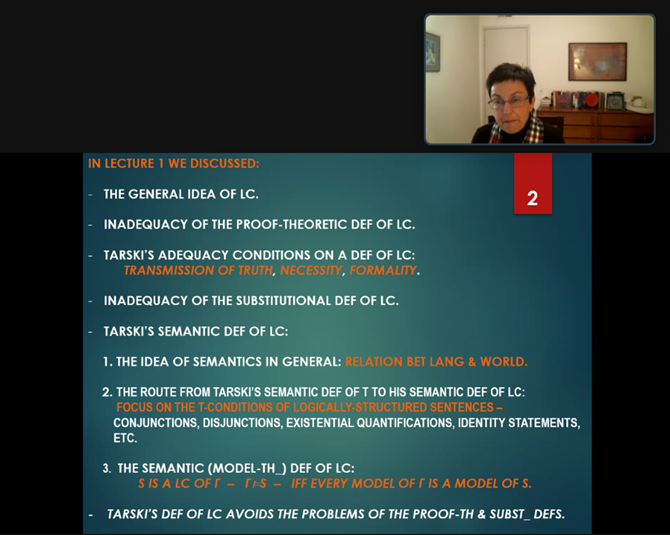 在此次讲座中,谢尔解释了逻辑后承定义不变性证明的一些衍生结果,尤其是对逻辑后承的传统特征进行再分析,并探讨逻辑与数学之间的关系;回应了学界对语义定义和逻辑性的不变性标准的批评,并为语义定义和逻辑性的不变性标准做辩护。