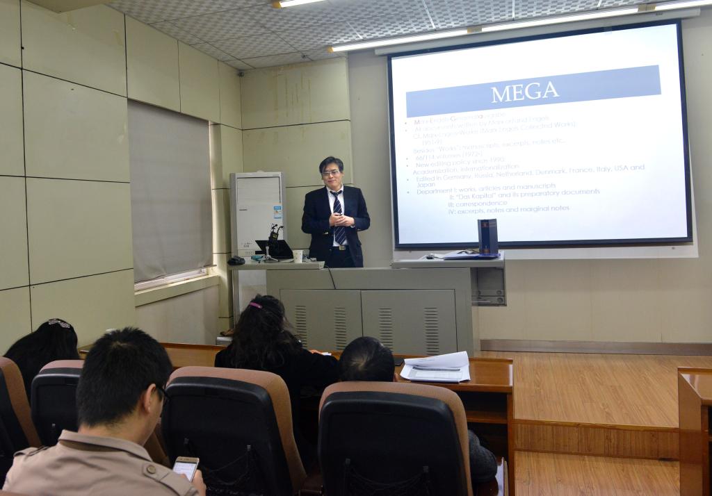 守健二教授首先简要介绍了MEGA2(Marx-Engels-Gesamtausgabe)即历史考证版《马克思恩格斯全集》的内容、结构等,并且就他承担的历史考证版第Ⅱ部分《资本论》及其相关手稿卷的编辑工作,详细讲解了《资本论》第二卷中恩格斯的编辑稿与马克思原稿的不同之处。现在主要的工作是编辑第IV部分即马克思恩格斯的摘录笔记等,今年春天已编辑出版其中的第14卷即马克思在1857-1858年所做的经济危机笔记,我院青年教师盛福刚也参与了部分编辑工作。他介绍了危机笔记背景、内部结构以及内容,指出它是马克思完整观察1857年首次世界经济危机所做的笔记,广泛剪辑了当时经济学著作和报刊对危机的研究评论,并且记录了他的思想变化,即从关注法国的货币市场可能造成的危机,进入到农产品市场和工业市场的研究。最后,马克思在危机笔记得出的结论是,1857年世界经济危机是一场双重危机,即工业的兴旺导致资本和劳动力从农业领域抽离出了,对工业领域过热投资,结果是工业领域生产过剩的同时,农业领域生产不足。这一双重危机理论的意义在于使我们看到传统的利润率下降规律以外的危机理论,表明马克思与古典政治经济学家的继承关系,以及马克思早期和晚期思想的一致性。