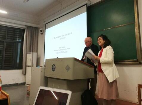 讲座开始,何萍老师对肖恩·塞耶斯教授作了介绍,并讲解了进步观在当代研究中的意义,强调以经济和技术为标准的工业化模式虽然带来了社会的巨大发展,但生态等一系列后现代问题相继产生,我们应该反思我们的进步观是不是正确?我们究竟应该采取什么样的进步观?当今越来越多的观点认为,所谓的“进步”应该以文化标准。