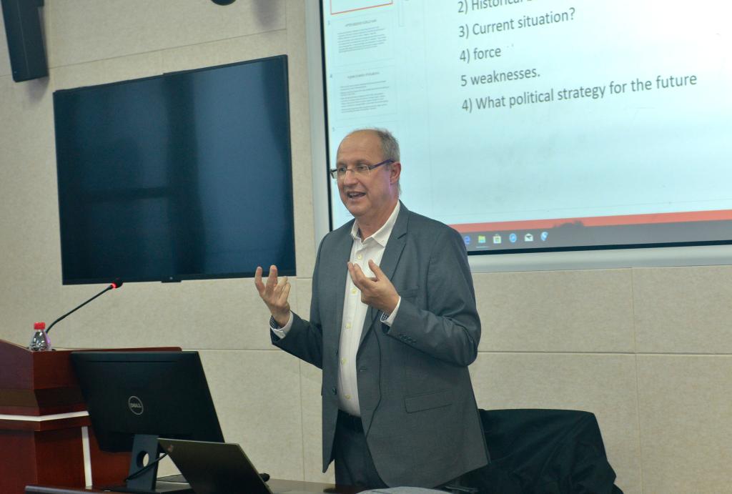 本网讯(通讯员:张萌)2018年11月9日,应成人视频 邀请,比利时法语布鲁塞尔自由大学(ULB)前副校长、政治学与社会学学院院长Jean-Michel DE WAELE教授来我院访问交流。晚上19:30,Jean-Michel DE WAELE教授在我院B214做了题为“当代欧洲激进左派的力量与困难”的讲座。讲座由何萍教授主持,来自我院师生共30余人参加了此次讲座。