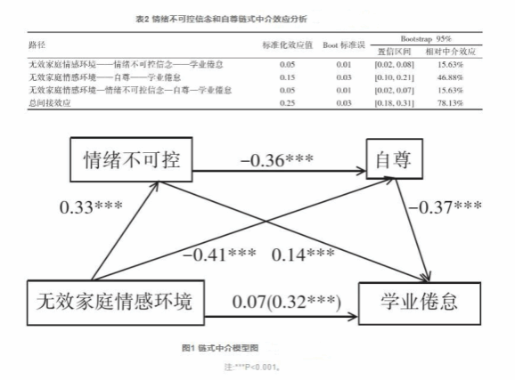 本研究发现,情绪不可控信念和自尊在无效家庭情感环境对学业倦怠的影响中同时起简单中介作用和链式中介作用。情绪不可控信念和自尊或许是无效家庭情感环境影响个体心理和行为的较为普遍的内在作用机制。