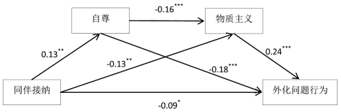 3.2 同伴接纳、物质主义、自尊和外化问题行为之间的链式中介