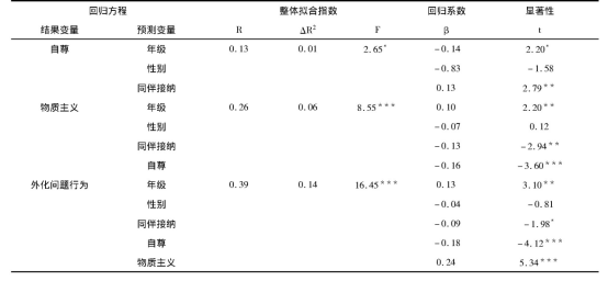 4.1 同伴接纳、物质主义、外化问题行为的特点
