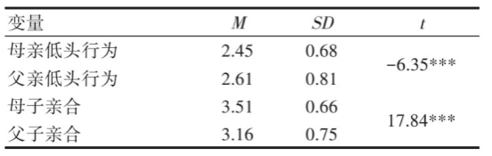 表1父母低头行为、亲子亲合的配对样本t检验结果(n=1034)