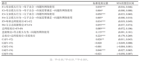 修订后的模型标准化结果显示:母亲低头行为正向预测问题性网络使用(β=0.14,P<0.001),负向预测母子亲合(β=-0.27,P<0.001);母子亲合正向预测归属需要满足(β=0.21,P<0.001);母子亲合和归属需要满足均负向预测问题性网络使用(β=-0.11,P<0.001;β=-0.06,P<0.05)。父亲低头行为负向预测父子亲合(β=-0.29,P<0.001);父子亲合正向预测归属需要满足(β=0.25,P<0.001);父子亲合和归属需要满足均负向预测问题性网络使用(β=-0.18,P<0.001;β=-0.06,P<0.05)。