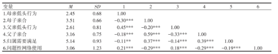 各变量相关分析结果表明(见表2),初中生的父或母低头行为、父子或母子亲合、归属需要满足和问题性网络使用两两之间均呈显著相关。
