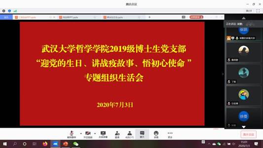 本网讯(通讯员:詹思群)2020年7月3日下午,成人视频 2019级博士生党支部开展了“迎党的生日、讲战疫故事、悟初心使命” 专题组织生活会和“共庆政治生日,永葆入党初心”的主题党日活动。支部党建指导老师吴昕炜出席本次会议,支部全体党员、积极分子参会。