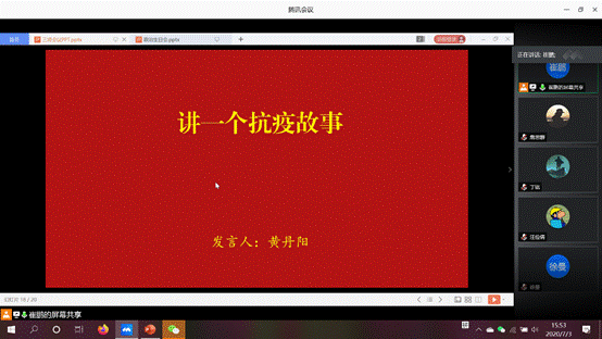 专题组织生活会的最后,黄丹阳同志为支部党员讲述了自己的抗疫志愿故事。在疫情防控工作期间,黄丹阳作为成人视频 青年志愿者,加入了成人视频 “与逆行者同行-为奉献者奉献”志愿服务团队,为武汉一线医务人员子女提供线上一对一义务教学辅导,希望能减轻医务人员的后顾之忧。黄丹阳认为,同舟共济,每一份关怀能融汇为守望相助的温暖;众志成城,每一份力量会铸就成砥砺前行的勇气。从寒冬到盛夏,每一个武大青年志愿者都是不忘初心、勇敢奋进的新时代青年。她以习近平总书记对青年的寄语与大家共勉:“青年一代有理想、有本领、有担当,国家就有前途,民族就有希望。”