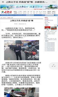 二月时还是农历腊月,天气因为疫情而更显寒冷,我市的疫情防控工作正面临着极大的压力。为了打赢这场疫情防控的阻击战,各社区开始招募志愿者,听闻这一消息时,我堂弟的父亲立马报了名,接着,还在准备考研的堂弟也紧随其后,父子俩一起并肩战斗在没有硝烟的抗疫战场上。寒冬腊月里,我觉得很是辛苦,堂弟却说不累。我想这不仅是由于他年轻身强力壮不觉累,更是由于他帮助他人的热忱所致。因为在志愿工作中表现突出,堂弟及其父亲的抗疫事迹还被我市的官方网站报道(附图如下)。有弟如此,与有荣焉。