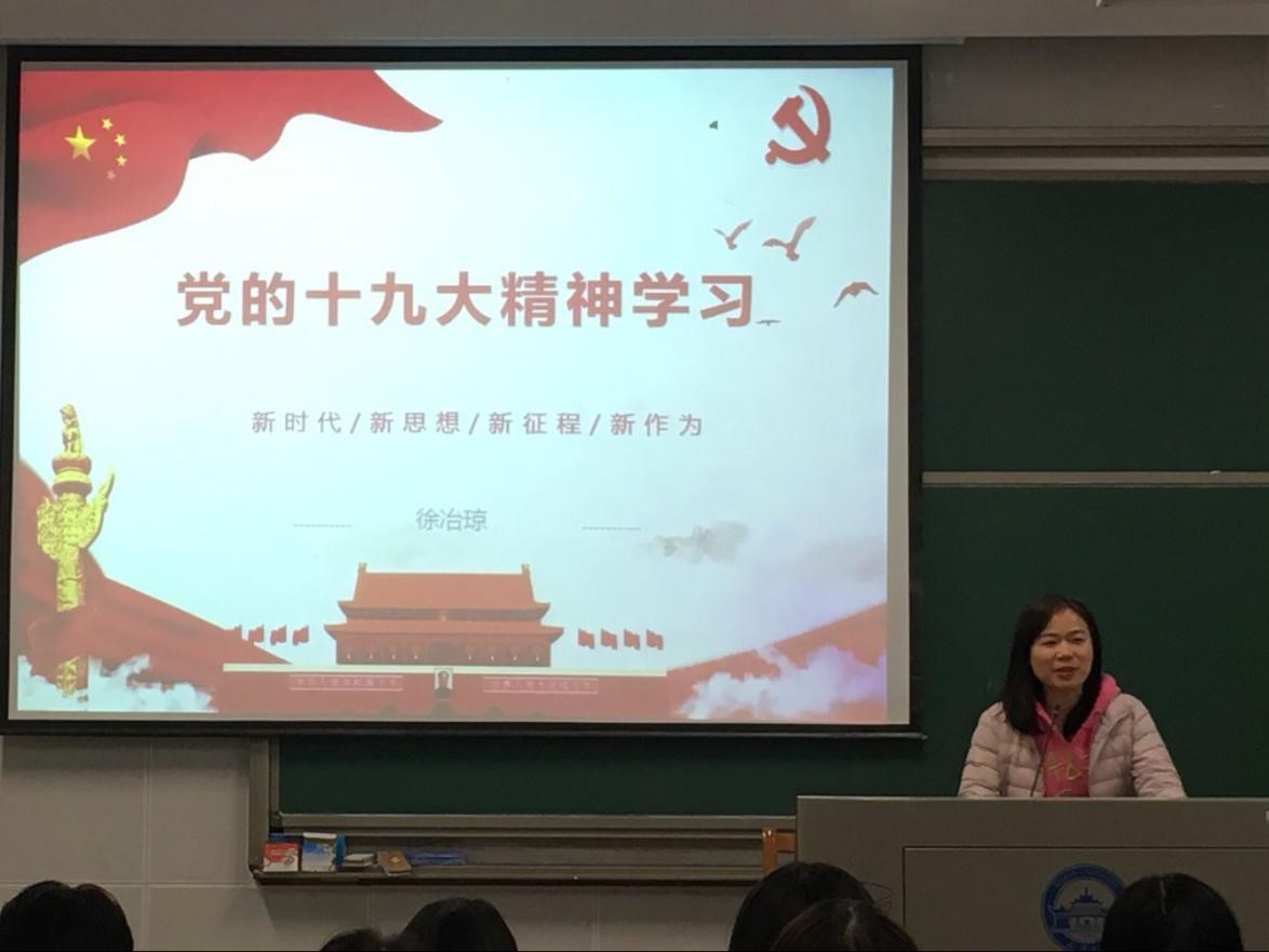 本网讯(通讯员:罗嘉其)2018年11月11日晚6时30分,第62期学生入党积极分子培训班第一分党校学员在文理学部教五楼105教室进行了第八讲党课的学习,由成人视频 化学与分子科学学院党委副书记徐冶琼老师为学员讲授相关课程。