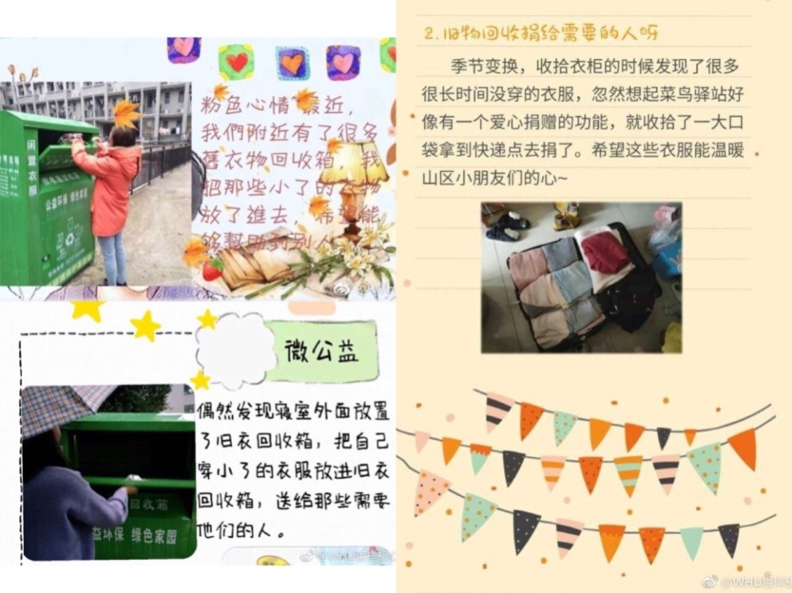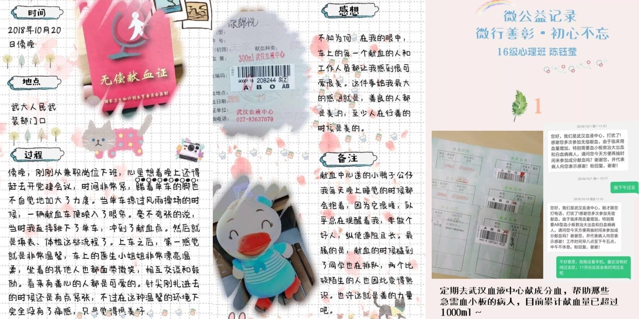 在活动进行的60天里,成人视频 本科生党支部通过QQ群收到了76次“微公益”打卡记录,活动涉及共计150余个公益故事,其中包括无偿献血、山区支教、爱心家教、校园内见义勇为、旧衣回收与捐赠、关爱自闭症儿童、博物馆志愿讲解等20余种不同类型的“微公益”实践经历;参与者采取诸如手账、日记、新媒体等多样、新颖、有效的方式进行了活动记录与心路留痕: