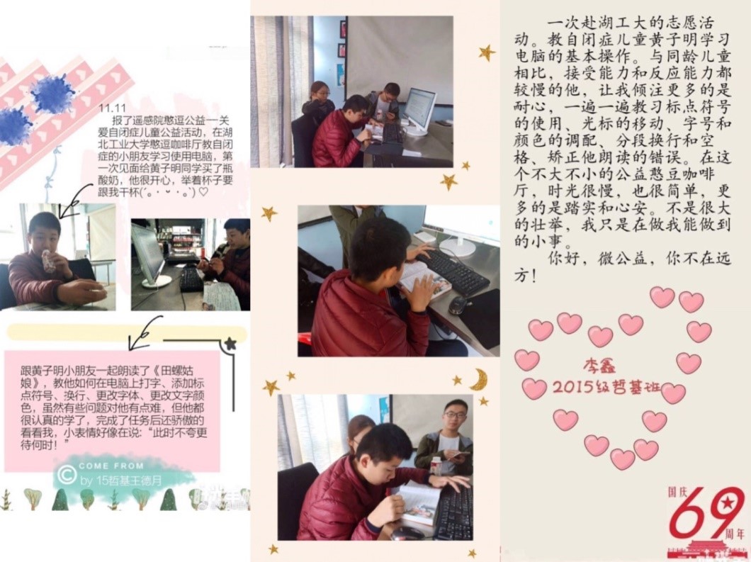 11月11日,王德月和李鑫两位同志赴湖北工业大学,完成了一次关爱自闭症儿童的公益活动,在活动过程中,两位微公益的实践者一对一地教授孩子阅读《田螺姑娘》并使用电脑中的文字处理软件,陪伴着孩子们进行他们所喜爱的文娱活动。