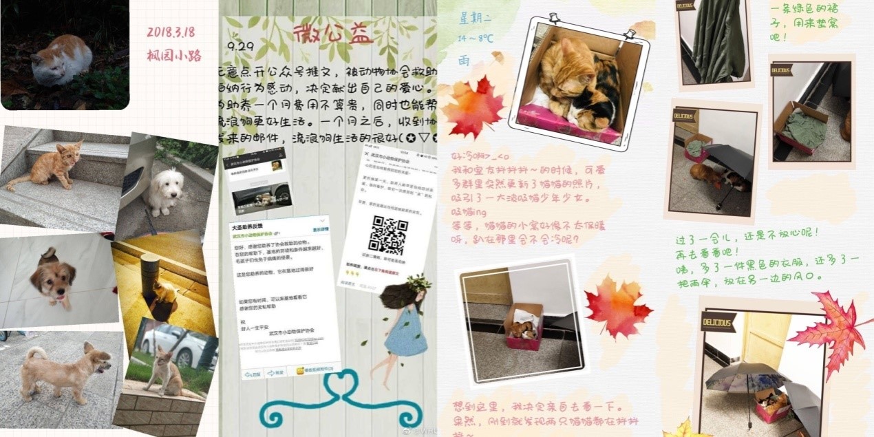 “高楼大厦间,水泥路旁,隐蔽的草丛里,地下通道的台阶上,夏天正午的餐馆里,这些都是我发现过他们的地方”,如实践者王雪琦所言,在艰难的生存条件下,饥饿、温差、疾病、交通工具随时都可能夺走流浪动物的生命。实践者们纷纷以实际行动倡导更多的人能够为他们停下脚步,以恰当的方式表达关爱,予流浪生命以更多的生存空间。