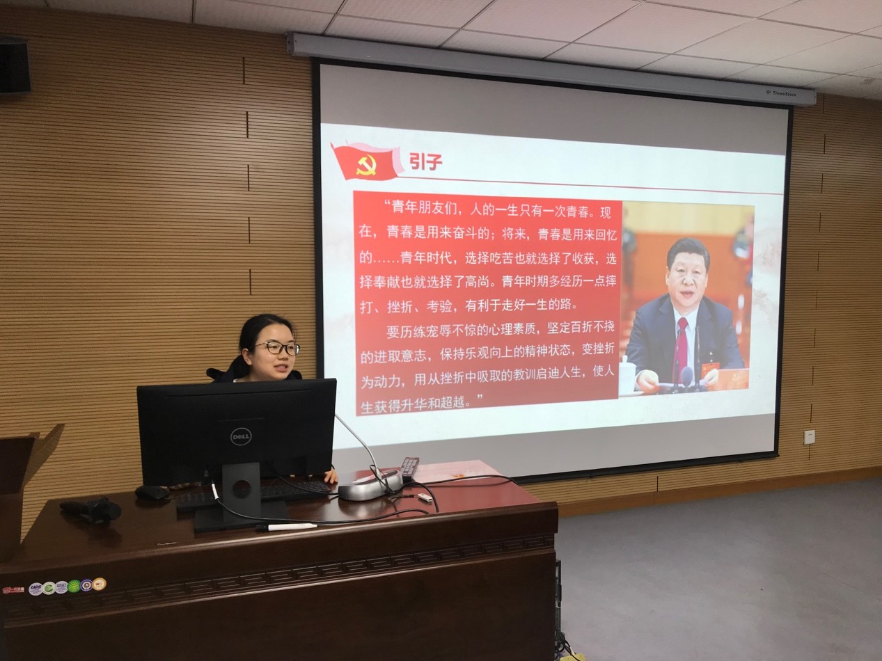 其次,通过梳理习近平总书记自2013年以来在“五四青年节”前后和青年人的交流活动和讲话内容,郭阳阳同志向我们传递了党和政府对当下我国广大青年人群体所寄予的殷切希望和嘱托。她总结为“四个要”:一是要爱国,忠于祖国、忠于人民;二是要励志,立鸿鹄志、做奋斗者;三是要求真,求真学问、练真本领;四是要力行,知行合一、做实干家。 最后,郭阳阳同志向我们介绍了华中农业大学“本禹志愿服务队”与河北保定学院西部支教毕业生的事迹,以此说明青年人在选择奋斗的方向时应该秉持自我奉献的精神。她同时还分享了她在本科毕业之后去新疆和田支教一年的经历,用她自己的亲身经历向我们展示奋斗着的美丽青春,鼓舞同志们为着更美好的明天去不断奋斗。