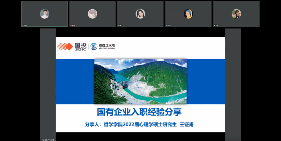 最后,2022届的硕士毕业生王钲甫进行了分享。他现就职于国家开发投资集团雅碧江公司。他向同学们分享国有企业入职全过程中需要做的准备和注意的细节。他从收集国有企业信息、分析国有企业架构、国企岗位工作内容三个方面出发让同学们更好地理解国企的性质。最后,他向同学们分享了寻找国企招聘信息的六个途径。