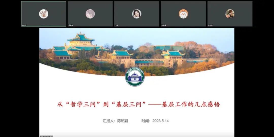 随后,哲学学学院2022届硕士毕业生陈昭君进行了分享,她是湖南省2022年的定向选调生,她就于湖南省株洲市茶陵县马江镇文江村担任党总支书记助理时的基层工作经历分享她的感悟与收获。她向同学们展示在基层工作的照片,告诉大家基层工作就是第一时间能够站出来为群众解决问题。她从基层的实际工作中总结到基层是一所没有书本的“大学”,要谦虚地学习干实事、办好事的方法和智慧,做好群众的“勤务员”。