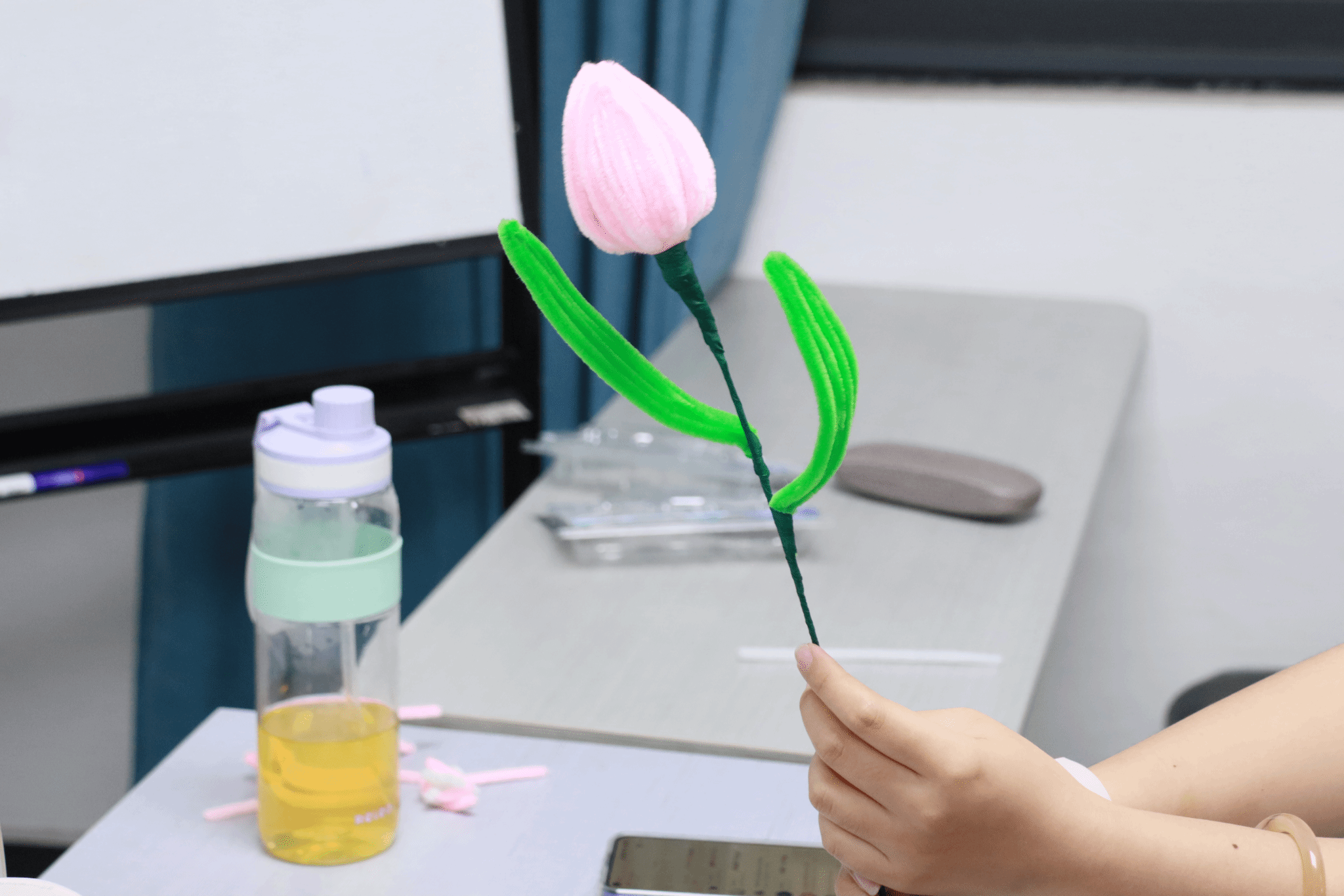 许多同学展现出了惊人的创意和手工天赋。一位同学利用扭扭棒制作了一束灿烂盛开的铃兰花,柔和的线条和明快的颜色让人赞叹不已。另一位同学则巧妙地将扭扭棒扭成了一只冰淇淋,丰富的细节和自然的形态引来众人称赞。