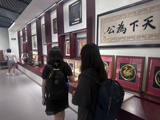 江欣苑社区以高龙文化为基础,先后引进了54个国家级、省市级非遗项目入驻园区,建成了“一坊两馆一街”:即武汉高龙城非物质文化遗产传承园百工坊和高龙博物馆、汉绣博物馆、楚香汉味一条街,是全国首家建在社区的非遗传承园。其中,作为湖北省民间传统美术,汉绣始于汉、兴于唐、盛于清,并于2008年列入国家级非物质文化遗产保护名录。汉绣博物馆作为湖北省第一家民办汉绣专题博物馆,也成为了解汉绣发展历史与现状的重要窗口。在参观汉绣博物馆的过程中,实践队员们欣赏到了琳琅满目的汉绣艺术作品,这些作品构思精巧、技法独特、色彩浓艳、纹样精美,体现出强烈的传统与现代融合之感。而汉绣线上数字展馆更让实践队员们深刻感受到了数字化时代汉绣非遗文化迸发的强大生机与活力。