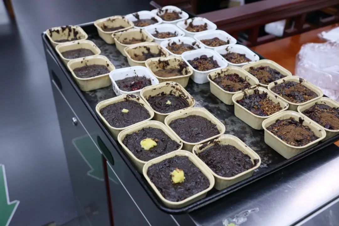 选择制作布朗尼蛋糕的同学们则展现出极致的细腻与耐心。他们精心调配每一种原料的比例并尽力将其搅拌至最佳状态。当面糊变得均匀而光滑时,他们轻轻地将其倒入模具中,并在表面撒上了美味的可可粉与坚果,为这道甜品增添了几分诱人的香气。