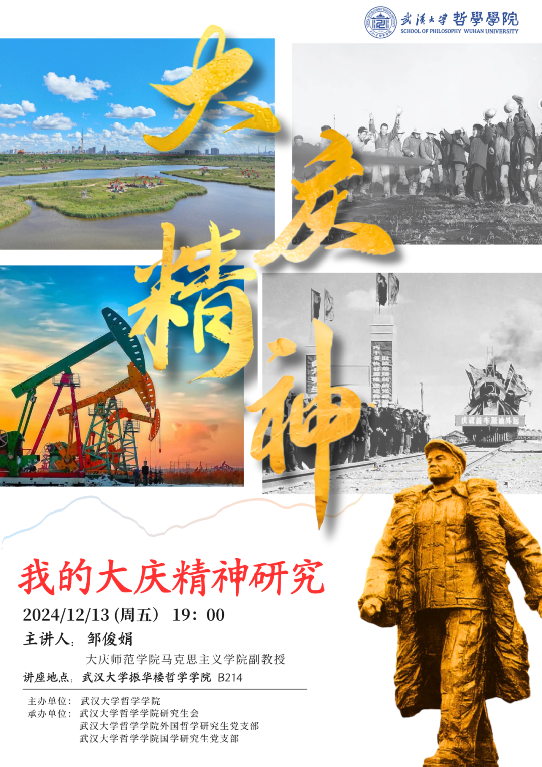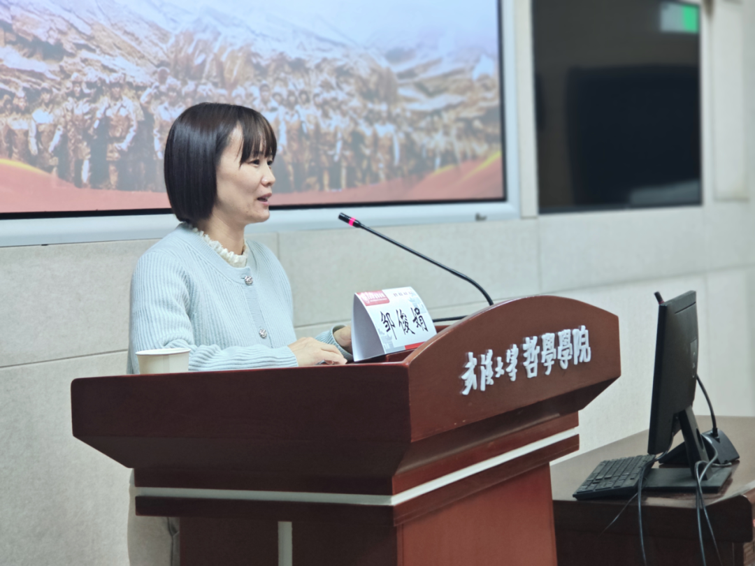 12月13日晚,我院于振华楼B214会议室成功举办“我的大庆精神研究”学术讲座。本次讲座由大庆师范学院马克思主义学院副教授邹俊娟担任主讲人,学工办副主任代丹妮主持。成人视频 党委副书记严璨、李维武教授、何萍教授出席会议,成人视频 研究生会、外国哲学研究生党支部、国学研究生党支部等40余名同学参与本次讲座。