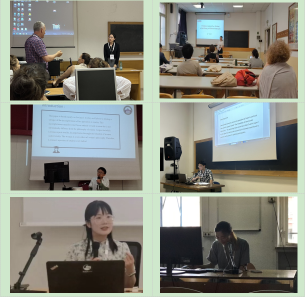 在中国哲学及伦理学、政治哲学领域,王家宝同学则聚焦于儒家政治哲学的核心问题,他的论文《先秦儒家的分配原则会包含平等主义吗?》探讨了儒家典籍中的分配原则与现代平等主义理论之间的关联性。他指出,先秦儒家思想中包含的分配正义理念,不仅具有文化价值,也为全球性的政治哲学对话提供了新的可能性。他通过与不同文化背景的学者交流,深刻认识到比较哲学在讨论全球性问题时的重要性。陈乾奕同学作题为Problem-Centered New Writing of the History of Chinese Philosophy的报告。该汇报以《中国哲学通史(学术版)》为核心,分析了这部通史如何以问题为导向重新书写中国哲学史,并突出了其在全球哲学研究中的理论贡献。吴航同学围绕庄子哲学展开了深入探讨,他的报告《庄子哲学及其现代意义》分析了“逍遥”与“齐物论”两大核心思想,并将其与西方存在主义哲学相比较。他强调,这两种哲学传统在现代社会的挑战中具有互补性价值,尤其是在回应存在困境和多样性议题方面。张意琳同学的报告则关注中国哲学的国际传播,她通过案例分析讨论了哲学如何成为文化传播的重要媒介。通过与意大利学者的交流,她意识到中国哲学在全球语境中的潜力,并进一步探讨了哲学传播与文化对话的交叉点。陈凡昕同学的报告《从摩尔悖论句管窥庄子对吊诡之言的使用》结合逻辑哲学与庄子思想进行创新性研究。她通过与国际学者的交流,获得了对吊诡之言研究的更广阔视野,并明确了未来的研究方向。李文希同学的论文《在天人合一中重建人的主体性》探讨了张世英先生的哲学思想。他强调,中国哲学的研究不能局限于文本解读,而应通过国际对话推动哲学比较的深入发展。这次汇报让他进一步体会到哲学交流对研究的重要性。燕正盛同学与苏鹏同学的论文分别从民间心理学的角度探讨了中国哲学在心灵哲学领域的独特贡献。他们的研究展示了中国传统文化在跨文化对话中对心灵哲学的丰富补充,并通过与不同文化背景的学者讨论,深化了理论与实践的结合。