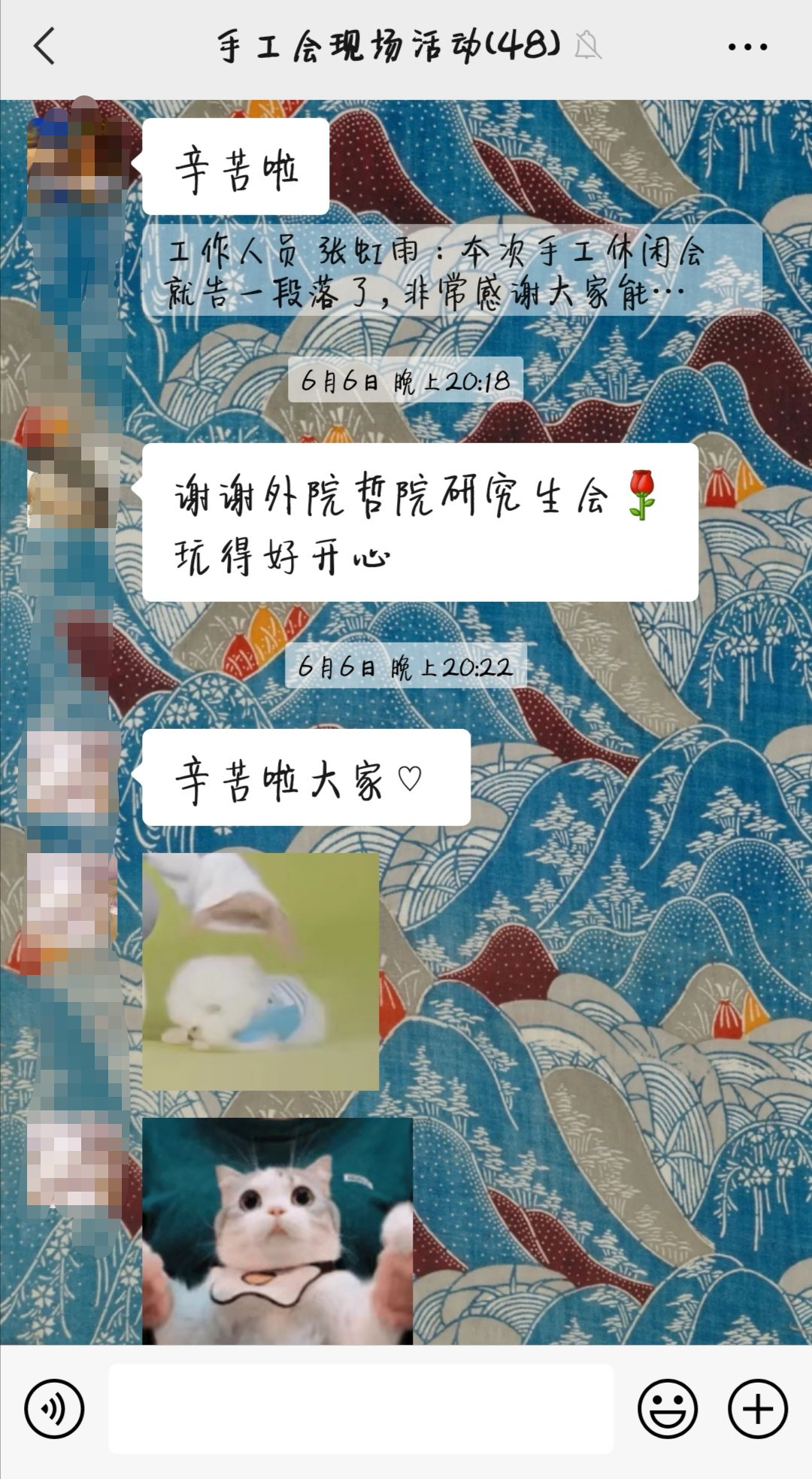 根据前方报道,我们了解到此次手机集体“失宠”事件的原因,原来是外院研会心灵汇和哲院研会心权部联合举办的第二届研究生手工休闲会!