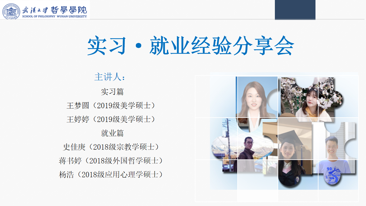 2021年6月17日下午15点,由成人视频 研究生会主办的“实习·就业经验分享会”在成人视频 B107顺利举行。本次经验分享会由2020级硕士研究生修风翊主持,内容分为实习和就业两个篇章,分别邀请到了2019级美学硕士研究生王梦圆以及王婷婷分享实习经验,2018级宗教学硕士研究生史佳庚、2018级外国哲学硕士研究生蒋书婷、2018级应用心理学硕士研究生杨浩分享就业经验。研究生兼职辅导员杜金玉出席了此次活动。