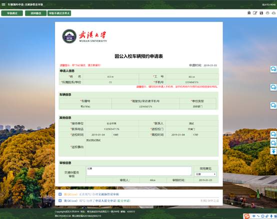 3. 交通协管员对申请单进行审批,可选择“审批通过”、“退回修改”、“审核不通过并终止”。审批通过后,保卫部负责人可在“待审核“栏查看到该表单;退回修改后申请人需要进行申请单的内容修改然后再次提交;审核不通过并终止后订单直接终止。