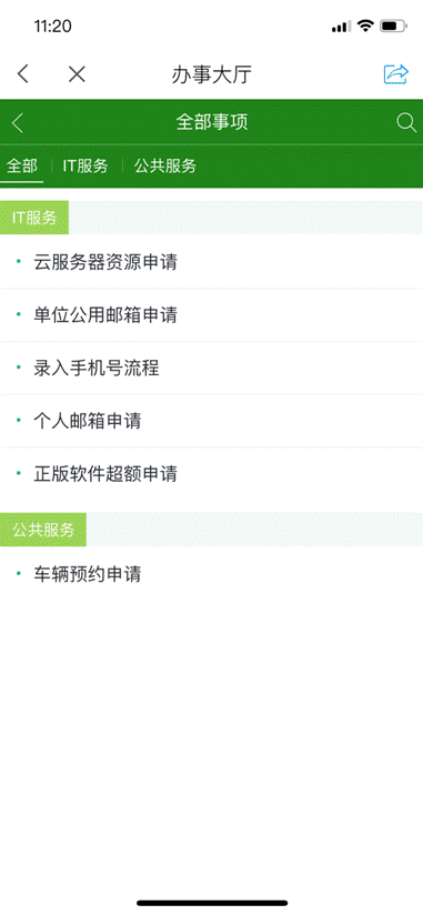 3. 车辆预约申请人可选择全部事项-->车辆预约申请,进入到车辆预约申请表单填写页面。申请人可以进入“进行中“栏来查看自己提交的车辆预约订单的状态。