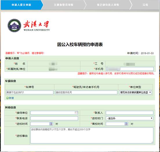 1. 车辆预约申请人填写相关信息。