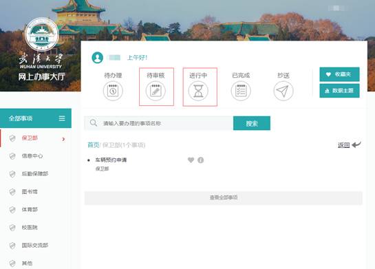 3. 车辆预约申请人可选择保卫部-->车辆预约,进入到车辆预约申请表单填写页面。申请人可以进入“进行中“栏来查看自己提交的车辆预约订单的状态。