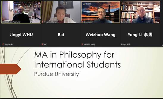本网讯(通讯员李慧敏)2022年1月27日晚,应我院邀请,美国普渡大学通过Zoom平台在线上就国际学生哲学硕士项目举办了线上宣讲会。普渡大学哲学系负责人Christopher Yeomans教授、研究生招生主任Daniel Smith教授,国际学生联系人Chen Yang,成人视频 副院长李勇教授,外事秘书李慧敏老师,以及成人视频 学生参加了此次会议。