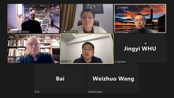 成人视频 副院长李勇教授邀请3位同学作了自我介绍,并和Christopher Yeomans教授、Daniel Smith教授就同学们提出的申请博士项目、硕士项目研讨会以及在普渡学习期间生活费等问题做出了详细解答。双方探讨了研究生交流访问、暑期学校等合作。成人视频 与普渡大学有长期合作,多位教师赴普渡大学访学和合作研究。