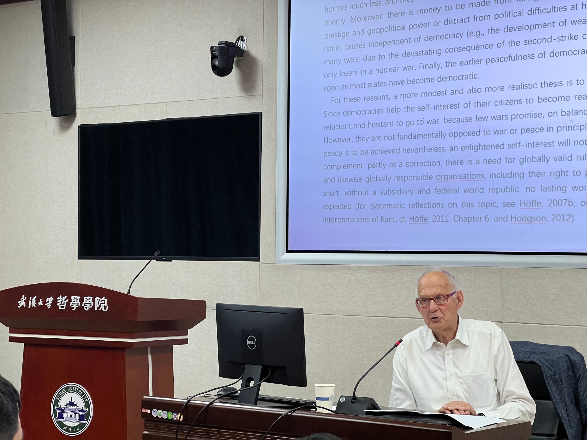 讲座伊始,赫费教授介绍了本次讲座的选题背景:尽管人们总是渴望一个全面且持久的和平,但和平从未成为哲学的一个基本概念。作为为数不多填补这一缺位的哲学家,康德在从《关于一种世界公民观点的普遍历史的理念》到《道德形而上学》的一系列作品中,对“永久和平”给予了持续关注。尤其在《永久和平论》中,康德对“永久和平”的反思在使用的概念和采用的论据方面都经过深思熟虑。这些反思充满了历史经验,并且受到之前关于和平的辩论的启发。然而,康德并没有将注意力分散到次要的历史问题上,而是集中精力解决基本问题。本次讲座主要是梳理康德对这些基本问题的创新性回答。